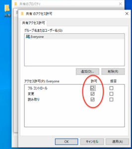 更に下の画像の赤丸部分“このフォルダーを共有する”にチェックを入れます。