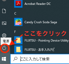 すると下図のようにシャットダウンという文字が出てきますので、そちらをクリックするとパソコンの電源を切ることができます。